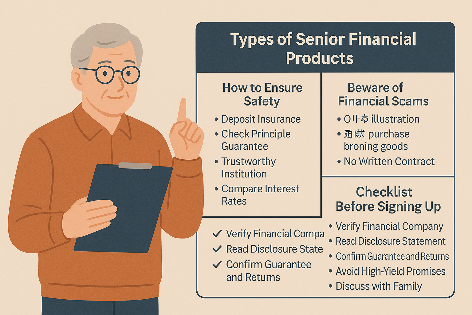 고령층 금융상품의 특징부터 안전하게 가입하는 방법까지 한눈에 정리노후 준비가 점점 중요해지면서 시니어를 위한 금융상품에 대한 관심도 높아지고 있습니다.안정적인 이자 수익과 원금 보장이 된다고 광고하는 상품들이 많지만, 정말 모두 안전할까요?최근 몇 년간 고령층을 대상으로 한 금융사기 피해가 늘어나면서 시니어 금융상품을 선택할 때는 더욱 신중해야 합니다.오늘은 시니어가 금융상품을 선택하기 전에 반드시 알아야 할 정보와 안전한 가입 방법을 상세히 알려드리겠습니다.1. 시니어 금융상품의 종류시니어를 대상으로 하는 금융상품은 대표적으로 아래와 같습니다.정기예금/적금 : 가장 기본적인 안전 금융상품입니다. 원금이 보장되며, 은행 예금자보호 제도로 인해 1인당 5천만 원까지는 안전하게 보호받을 수 있습니다.연금저축..