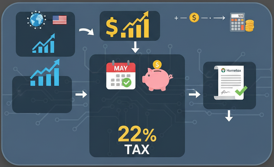 '서학개미'라는 말이 보편화될 정도로 많은 분이 미국 주식을 포함한 해외 주식에 투자하고 있습니다. 달러 자산을 보유하고 세계 1등 기업에 투자한다는 장점도 크지만, 매년 5월이 되면 꼭 챙겨야 할 '숙제'가 있습니다. 바로 '해외 주식 양도소득세' 신고입니다.국내 주식과 달리 해외 주식은 매매 차익에 대해 세금이 발생합니다. 조금 복잡하게 느껴질 수 있지만, 250만 원 기본공제라는 훌륭한 혜택도 있으니 오늘 그 방법을 명확하게 알아보겠습니다.5월은 해외 주식 양도소득세 신고의 달가장 먼저 기억해야 할 것은 시기입니다. 해외 주식 양도소득세는 전년도 1월 1일부터 12월 31일까지 발생한 모든 해외 주식(ETF 포함)의 매매 손익을 합산하여 신고합니다. 그리고 신고 및 납부 기간은 매년 5월 1일부터 ..