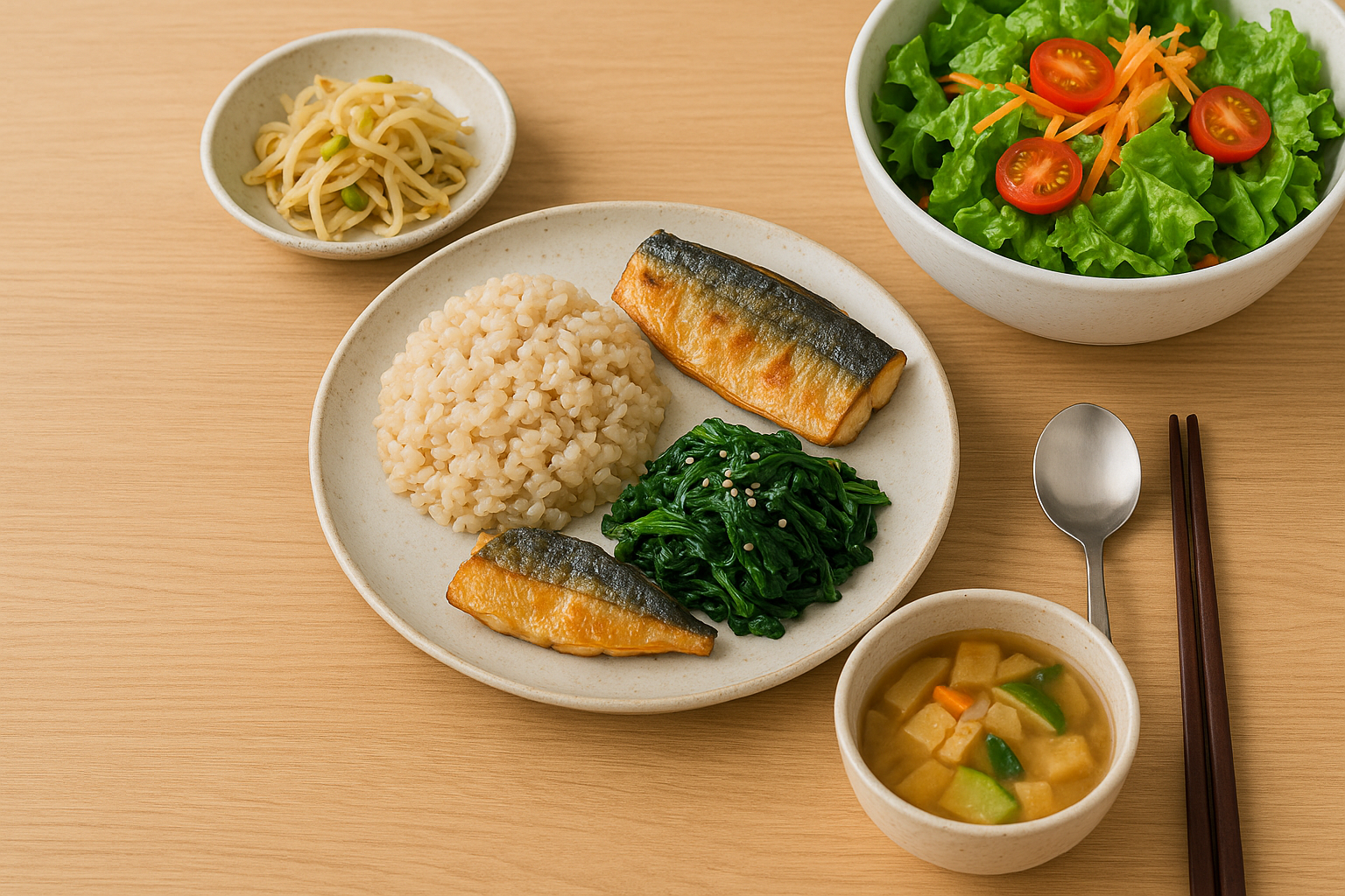 점심 귀리밥 + 생선구이 + 된장국 + 샐러드 저염식 구성으로 혈압/혈당 동시 관리